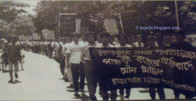 ছবিঘর সমস্তপ্রতিষ্ঠাবাষিকীসম্মেলনআন্দোলন ভমিরক্ষা আন্দোলন ৪ মে লংগদু গণহত্যার প্রতিবাদে ঢাকায় পিসিপি’র প্রথম মৌন মিছিল, ২১ মে ১৯৮৯। প্রথম কেন্দ্রীয় সম্মেলনের মিছিল, ঢাকা বিশ্ববিদ্যালয় কলাভবন প্রদক্ষিণ করছে, ১৯৯১ লোগাং হত্যাযজ্ঞের প্রতিবাদে পদযাত্রায় হাজার হাজার মানুষের ঢল। ২৮ এপ্রিল ১৯৯২। নানিয়াচর হত্যাযজ্ঞের শহীদদের সম্মান প্রদর্শন করছেন তৎকালীন পিসিপি’র সভাপতি ও সাধারণ সম্পাদক প্রসিত বিকাশ খীসা ও করুণাময় চাকমাসহ অন্যান্য নেতৃবৃন্দ। ১৯ নভেম্বর ১৯৯৩, নানিয়াচর অত্যাচারী শাসক-শোষকের অন্যায় ১৪৪ ধারা উপেক্ষা করে পুলিশের নিক্ষেপ করা টিয়ার গ্যাসের শেল কুড়িয়ে নিচ্ছে পিসিপি’র দুর্দান্ত সাহসী সেনানীরা। ১০ ফেব্রুয়ারী, ১৯৯৪, খাগড়াছড়ি। পিসিপি কর্মীদের সংগৃহীত টিয়ার গ্যাসের শেল খুঁটিয়ে দেখছেন তৎকালীন সভাপতি প্রসিত বিকাশ খীসা। ১১ ফেব্রুয়ারী, ১৯৯৪, খাগড়াছড়ি।